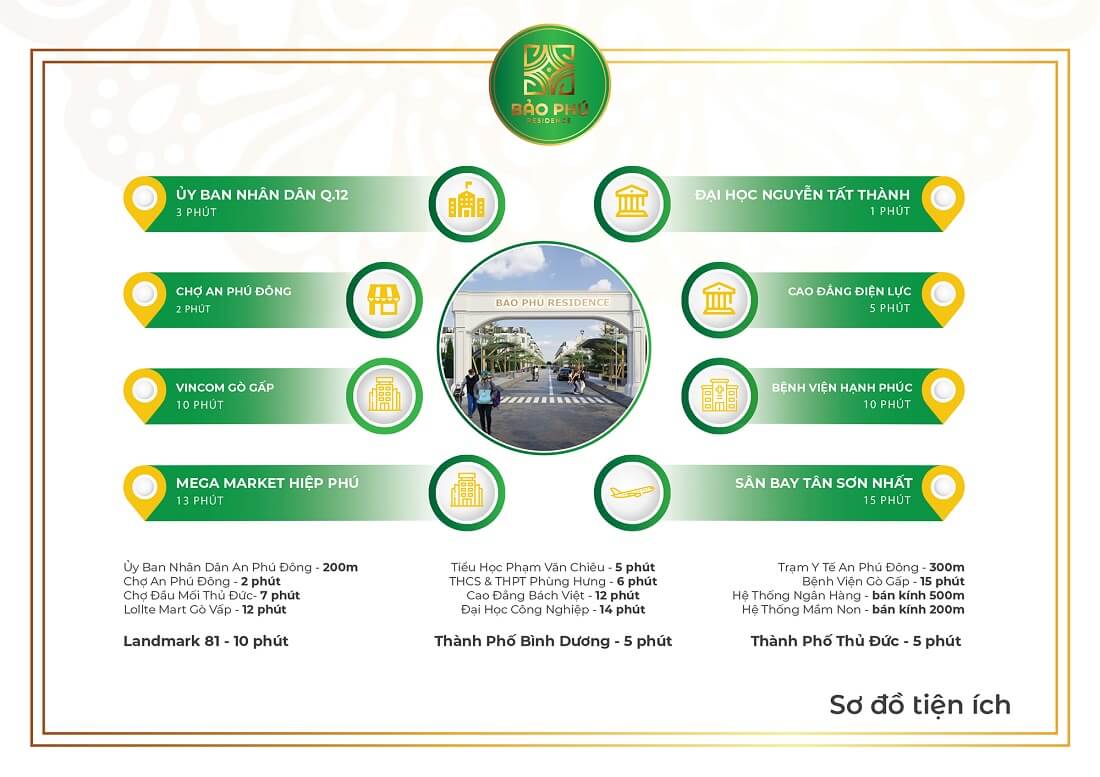 Bảo Phú Residence còn sở hữu vị trí đắc địa, chỉ với vài phút di chuyển có thể tiếp cận những tiện ích hiện hữu như: 1 phú di chuyển đến ĐH Nguyễn Tất Thành, 2 phút đến chợ An Phú Đông, 3 phút đến UBND Quận 12, 5 phút đến Cao đẳng Điện Lực, 10 phút đến Vincom Gò Vấp, bệnh viện Hạnh Phúc và khoảng 15 phút đến Mega Hiệp Phú và sân bay Tân Sơn Nhất.