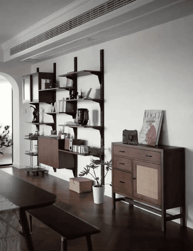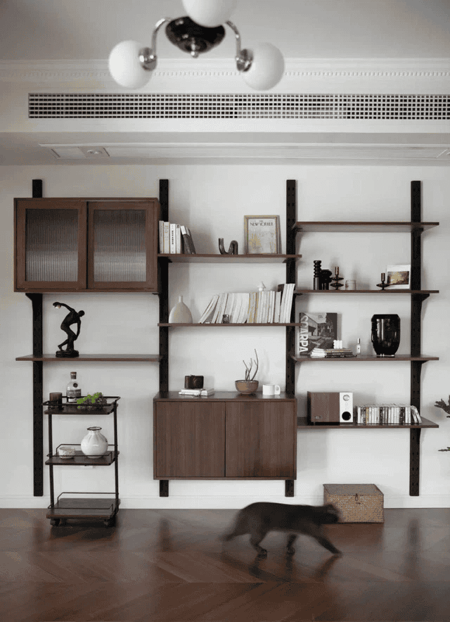 Sống một mình và không thích sự ồn ào, gia chủ lựa chọn loại bỏ tivi ra khỏi những món đồ có mặt bên trong không gian sinh hoạt chung. Phần không gian đặt tivi được thay thế bằng một kệ gỗ gắn tường đa năng, cung cấp không gian lưu trữ và trưng bày đồ lưu niệm sau mỗi chuyến du lịch của nữ chủ nhân.