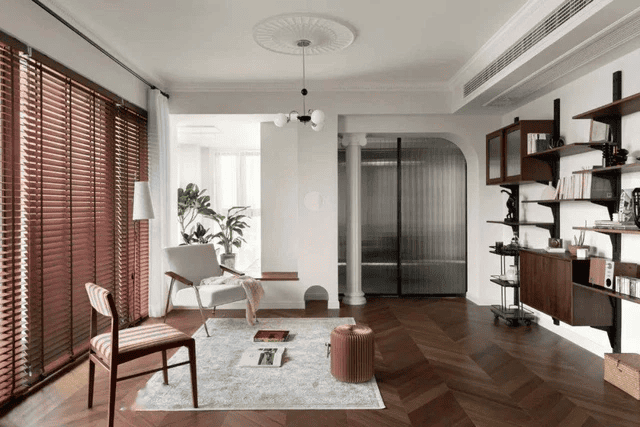 Không gian sinh hoạt chung sử dụng đều là cửa kính để đón nhận được nhiều ánh sáng tự nhiên từ bên ngoài. Để kiểm soát lượng ánh sáng vào trong nhà, gia chủ sử dụng hệ thống rèm sáo gỗ đồng màu với sàn gỗ óc chó, mang đến sự ăn ý trong tổng thể thiết kế căn phòng.