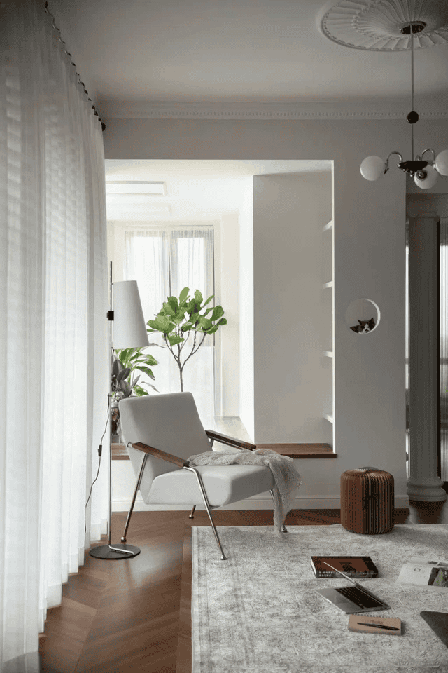 Căn hộ 120m² được thiết kế với gam màu trắng chủ đạo và nội thất gỗ óc chó mang vẻ đẹp thanh lịch, sang trọng. Mọi ô cửa sổ đều có kích thước lớn khiến không gian sống thoáng đãng, đem đến cảm giác thư thái ngay khi vừa bước chân vào căn hộ.