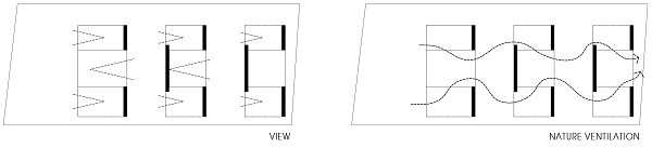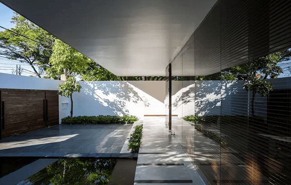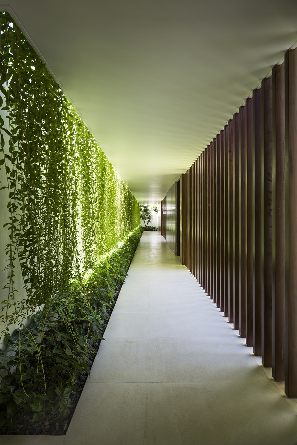Các căn phòng trong nhà được thiết kế dạng hộc kéo, khi kéo ra để lại các khoảng trống, đó là những hành lang xanh với dây leo kín tường. Các kiến trúc sư đã tối giản số lượng màu sắc sử dụng ở đây bằng cách sử dụng sơn tường màu trắng và vách ngăn là các cột gỗ để làm nổi bật lên khoảng tường xanh mướt mát.