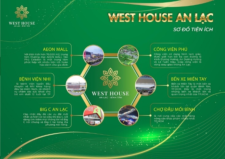Từ dự án West House An Lạc, cư dân có thể tiếp cận những tiện ích ngoại khu lân cận như: Aeon Mall, Bic C An Lạc, bệnh viện Nhi Đồng, công viên Phú Lâm, bến xe Miền Tây, chợ đầu mối Bình Điền, …